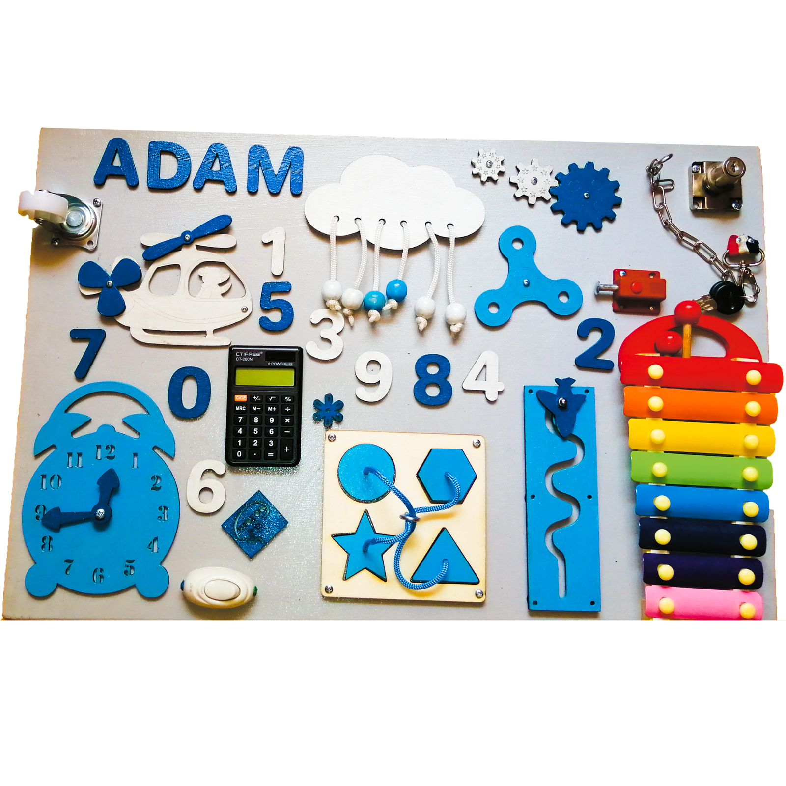 BusyBoard Montessori Personnalisé avec Prénom - Planche d'Activité en Bois Fabriquée au Maroc BusyBoard Montessori Personnalisé avec Prénom - Planche d'Activité en Bois Fabriquée au Maroc